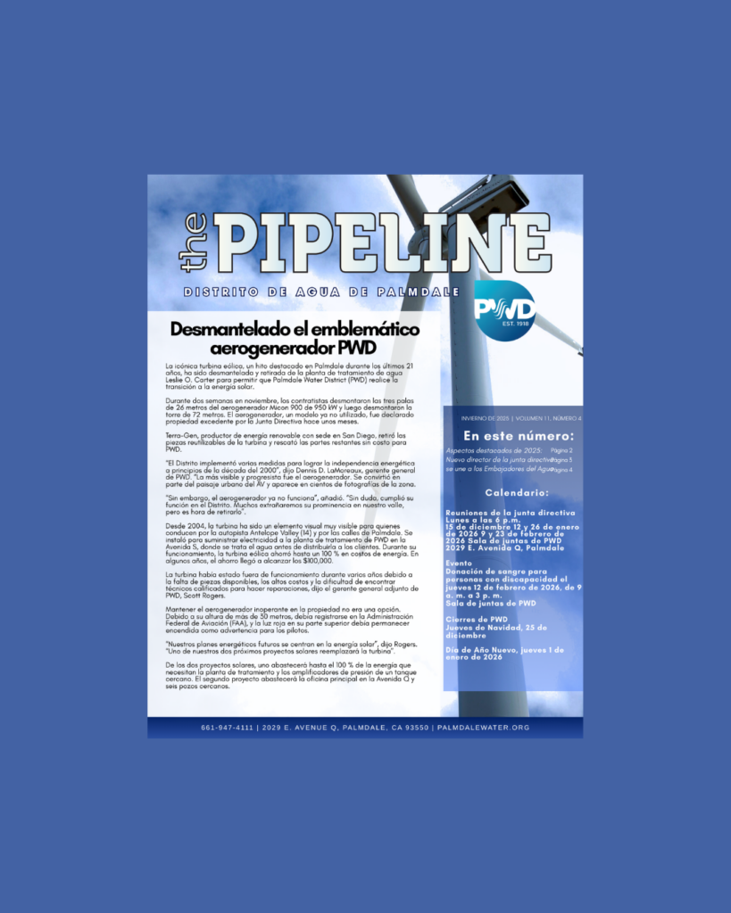 Palmdale Water District (PWD) is pleased to announce that its customer newsletter, The Pipeline, has been recognized by the Public Relations Society of America – Los Angeles (PRSA-LA) Chapter with a PRism Award of Excellence.